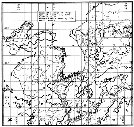 o 금주(2006.04.11~04.17)의 한국근해 표면수온은 대화퇴 7~10, 울릉도 근해 10~11도, 대마도 근해 14~16도, 제주도 근해 13~16도, 이어도 근해 9~11도, 일향초 근해 8~10도, 어청도 근해 6~7도 내외로 나타납니다.