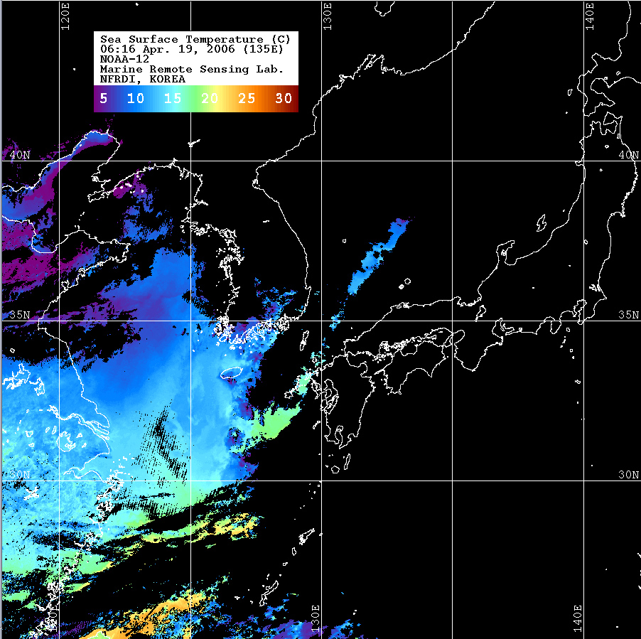 o 2006년 04월 19일 06시 16분 NOAA-12호 위성영상입니다. o 수온분포는 범례를 참고하시기 바랍니다. o 검은색은 구름 또는 육지를 나타냅니다.