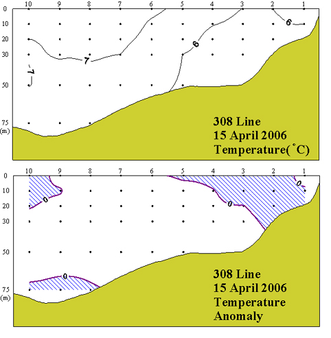 ◦ 2006년 4월 15일 국립수산과학원 서해수산연구소에서 조사한 308선(대천 서방)의 수직수온분포도 및 평년편차도 입니다.