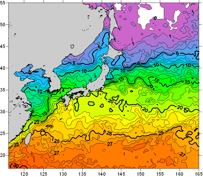 o 2010년 04월 19일 북서태평양 광역해양 수온분포 입니다. o 아래 위성 수온분포도는 국립수산과학원(NFRDI, Korea)과 일본동북대학교 (Tohoku University, Japan)가 공동연구개발 진행중, 1차 연구결과인 것으로 구름의 영향을 배제한 신기술의 수온정보입니다.