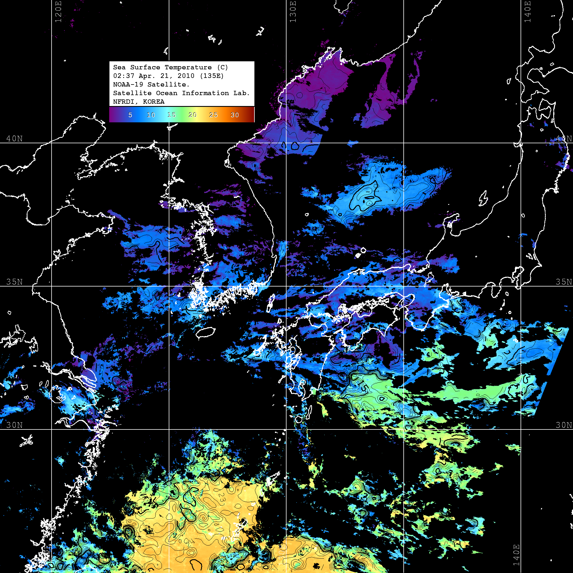 o 2010년 04월 21일 02시 37분 NOAA-19호 위성영상입니다. o 수온분포는 범례를 참고하시기 바랍니다. o 검은색은 구름을 나타냅니다. o 그림을 클릭하시면 크게 보실 수 있습니다.