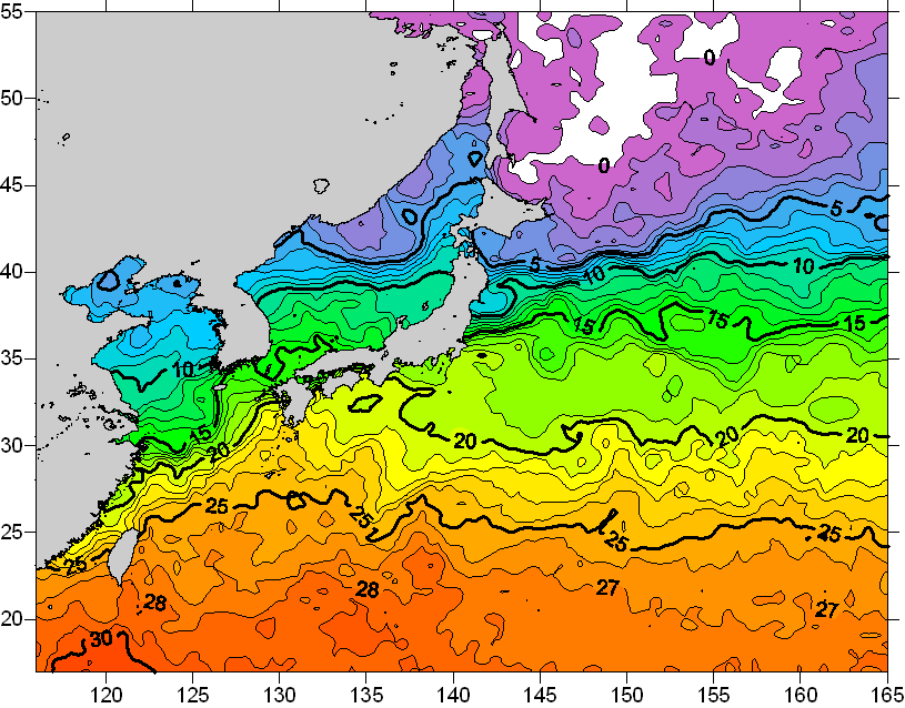 o 2010년 04월 21일 북서태평양 광역해양 수온분포 입니다. o 아래 위성 수온분포도는 국립수산과학원(NFRDI, Korea)과 일본동북대학교 (Tohoku University, Japan)가 공동연구개발 진행중, 1차 연구결과인 것으로 구름의 영향을 배제한 신기술의 수온정보입니다.