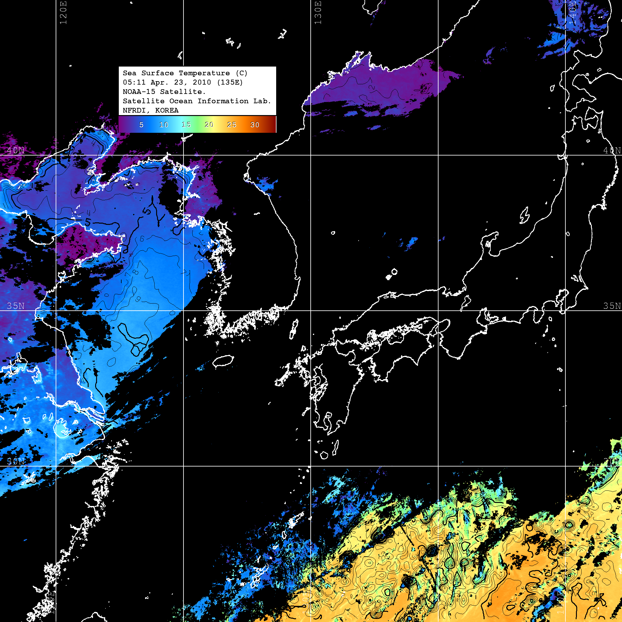 o 2010년 04월 23일 05시 11분 NOAA-15호 위성영상입니다. o 수온분포는 범례를 참고하시기 바랍니다. o 검은색은 구름을 나타냅니다. o 그림을 클릭하시면 크게 보실 수 있습니다.