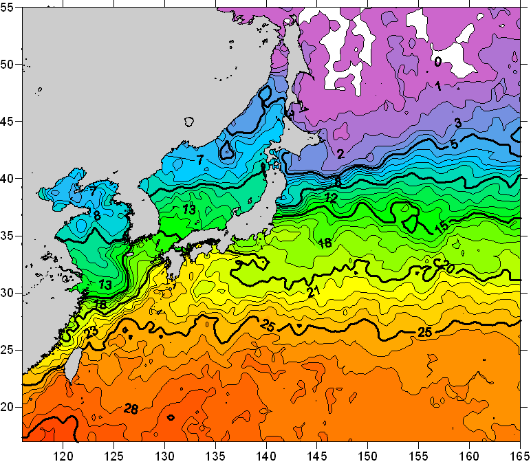 o 2010년 04월 23일 북서태평양 광역해양 수온분포 입니다. o 아래 위성 수온분포도는 국립수산과학원(NFRDI, Korea)과 일본동북대학교 (Tohoku University, Japan)가 공동연구개발 진행중, 1차 연구결과인 것으로 구름의 영향을 배제한 신기술의 수온정보입니다.