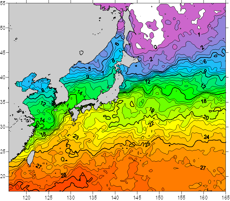 o 2010년 04월 24일 북서태평양 광역해양 수온분포 입니다. o 아래 위성 수온분포도는 국립수산과학원(NFRDI, Korea)과 일본동북대학교 (Tohoku University, Japan)가 공동연구개발 진행중, 1차 연구결과인 것으로 구름의 영향을 배제한 신기술의 수온정보입니다.
