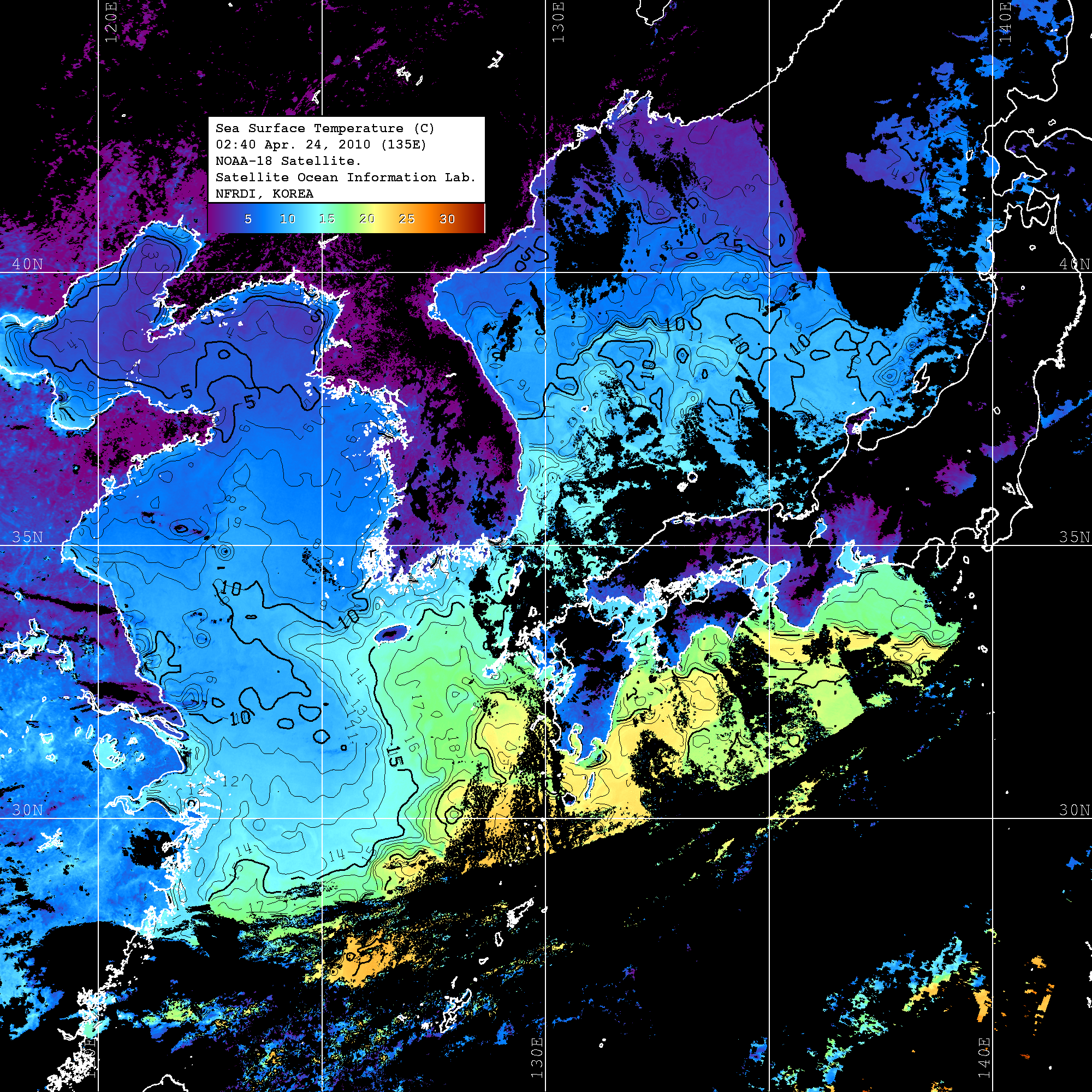 o 2010년 04월 24일 02시 40분 NOAA-18호 위성영상입니다. o 수온분포는 범례를 참고하시기 바랍니다. o 검은색은 구름을 나타냅니다. o 그림을 클릭하시면 크게 보실 수 있습니다.