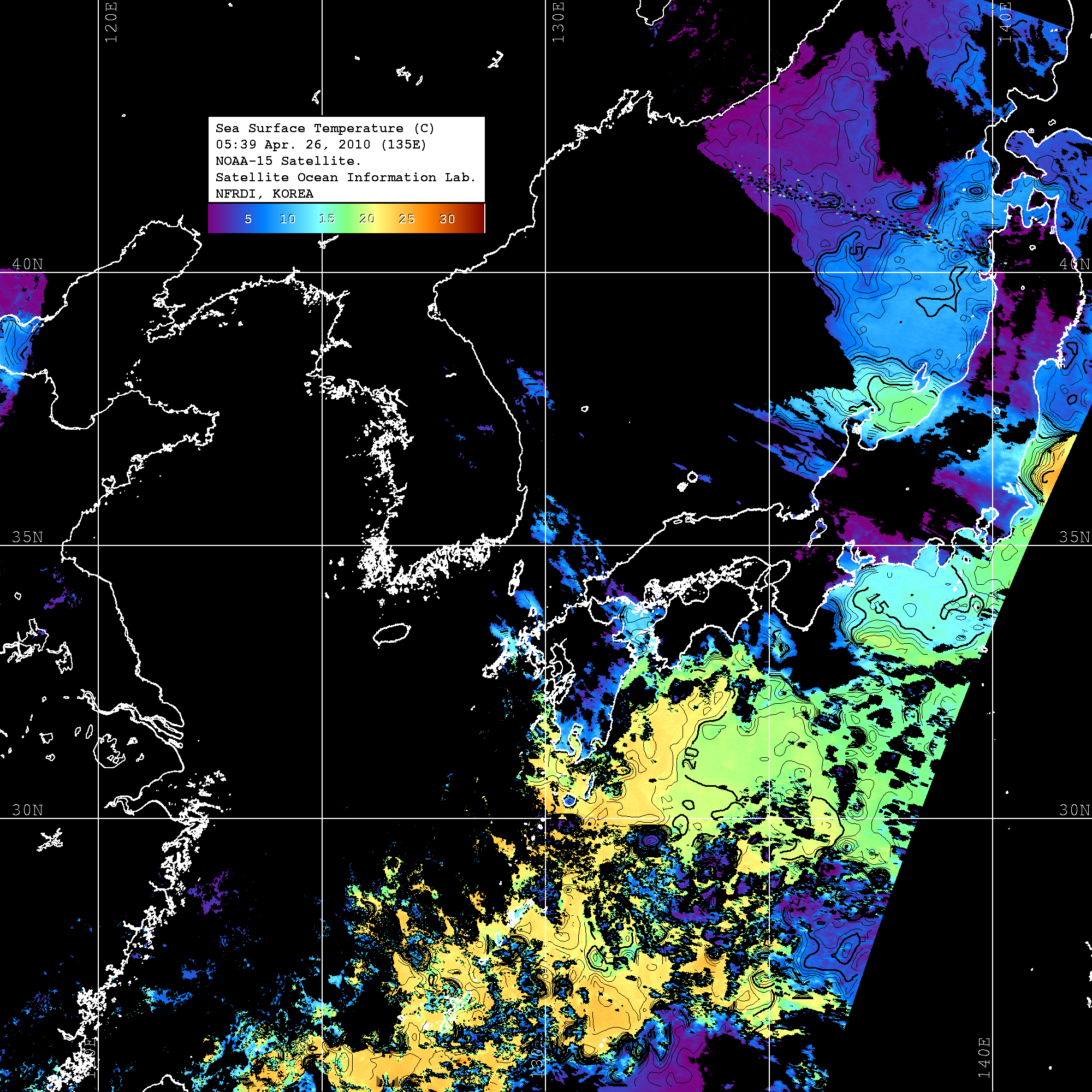 o 2010년 04월 26일 05시 39분 NOAA-15호 위성영상입니다. o 수온분포는 범례를 참고하시기 바랍니다. o 검은색은 구름을 나타냅니다. o 그림을 클릭하시면 크게 보실 수 있습니다.
