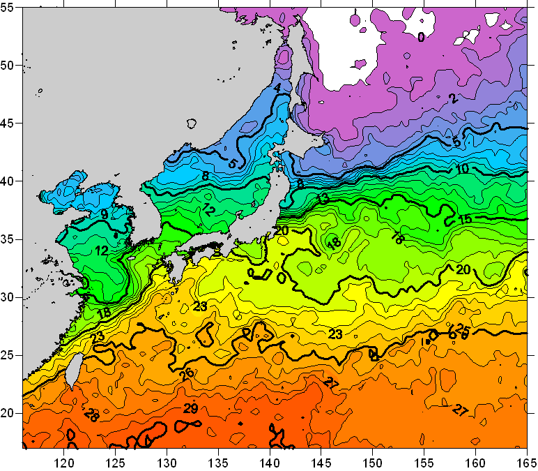 o 2010년 04월 25일 북서태평양 광역해양 수온분포 입니다. o 아래 위성 수온분포도는 국립수산과학원(NFRDI, Korea)과 일본동북대학교 (Tohoku University, Japan)가 공동연구개발 진행중, 1차 연구결과인 것으로 구름의 영향을 배제한 신기술의 수온정보입니다.