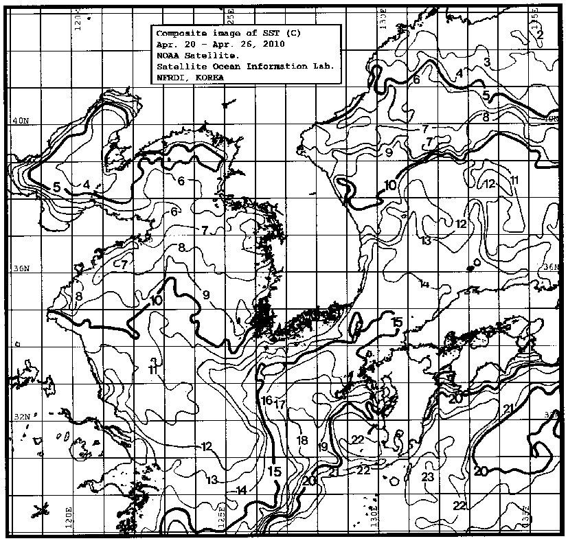 o 금주(2010.04.20~2010.04.26)의 한국근해 표면수온은 대화퇴 근해 6~10도, 울릉도 근해 11~13도, 대마도 근해 13~16도, 제주도 근해 12~17도, 이어도 근해 11~13도, 가거초 근해 9~13도, 어청도 근해 7~9도로 나타납니다. o「평년에 비해」대화퇴 근해 비슷하게, 울릉도 근해 1.1도 높게, 대마도 근해 비슷하게, 제주도 근해 0.3도 높게, 이어도 근해 0.7도 높게, 가거초 및 어청도 근해는 0.4도 높게 나타납니다. o「전년에 비해」대화퇴 근해 1.0도 낮게, 울릉도 근해 비슷하게, 대마도 및 제주도 근해 0.5도 낮게, 이어도 근해 비슷하게, 가거초 근해 1.0도 높게, 어청도 근해는 0.5도 낮게 나타납니다. o 수온 전선대는 우리나라 제주해협에서 대한해협까지 14도를 중심으로 형성됩니다.