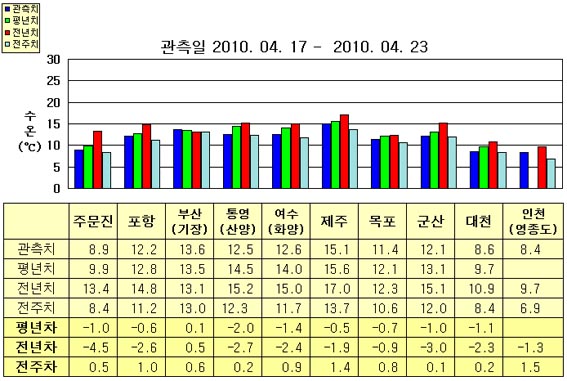 o 금주(2010.04.17~2010.04.23)의 한반도 연안 표면수온은 동해 연안역에서 섭씨 8.5~14.0도, 남해 연안역 12.5~15.5도, 서해 연안역에서 8.0~12.5도로 나타납니다. o 평년에 비해 부산 비슷함을 제외한 동해 연안역은 0.5~1.0도 낮게, 남해 연안역은 0.5~2.0도 낮게, 서해 연안역은 0.5~1.0도 낮게 나타납니다. o 전년에 비해 부산(기장) 0.5도 높음을 제외한 동해 연안역은 2.5~4.5도 낮게, 남해 연안역은 2.0~3.0도 낮게, 서해 연안역은 0.5~3.0도 낮게 나타납니다.