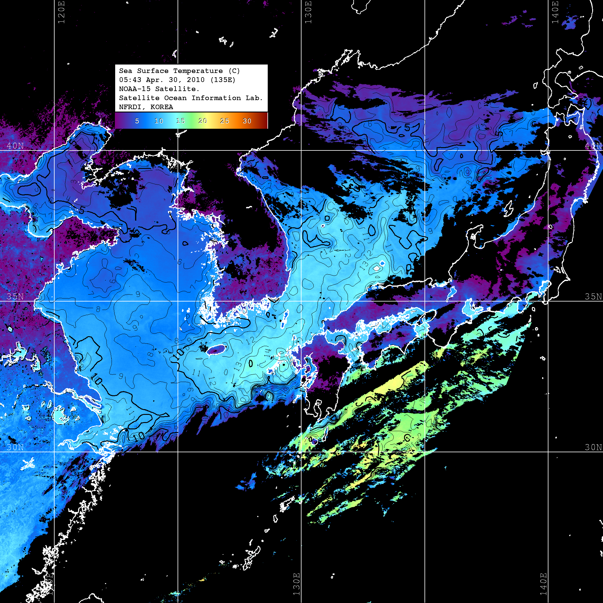 o 2010년 04월 30일 05시 43분 NOAA-15호 위성영상입니다. o 수온분포는 범례를 참고하시기 바랍니다. o 검은색은 구름을 나타냅니다. o 그림을 클릭하시면 크게 보실 수 있습니다.