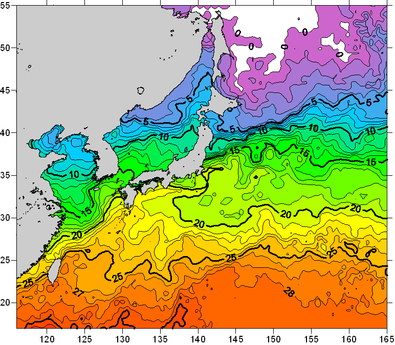 o 2010년 05월 01일 북서태평양 광역해양 수온분포 입니다. o 아래 위성 수온분포도는 국립수산과학원(NFRDI, Korea)과 일본동북대학교 (Tohoku University, Japan)가 공동연구개발 진행중, 1차 연구결과인 것으로 구름의 영향을 배제한 신기술의 수온정보입니다.