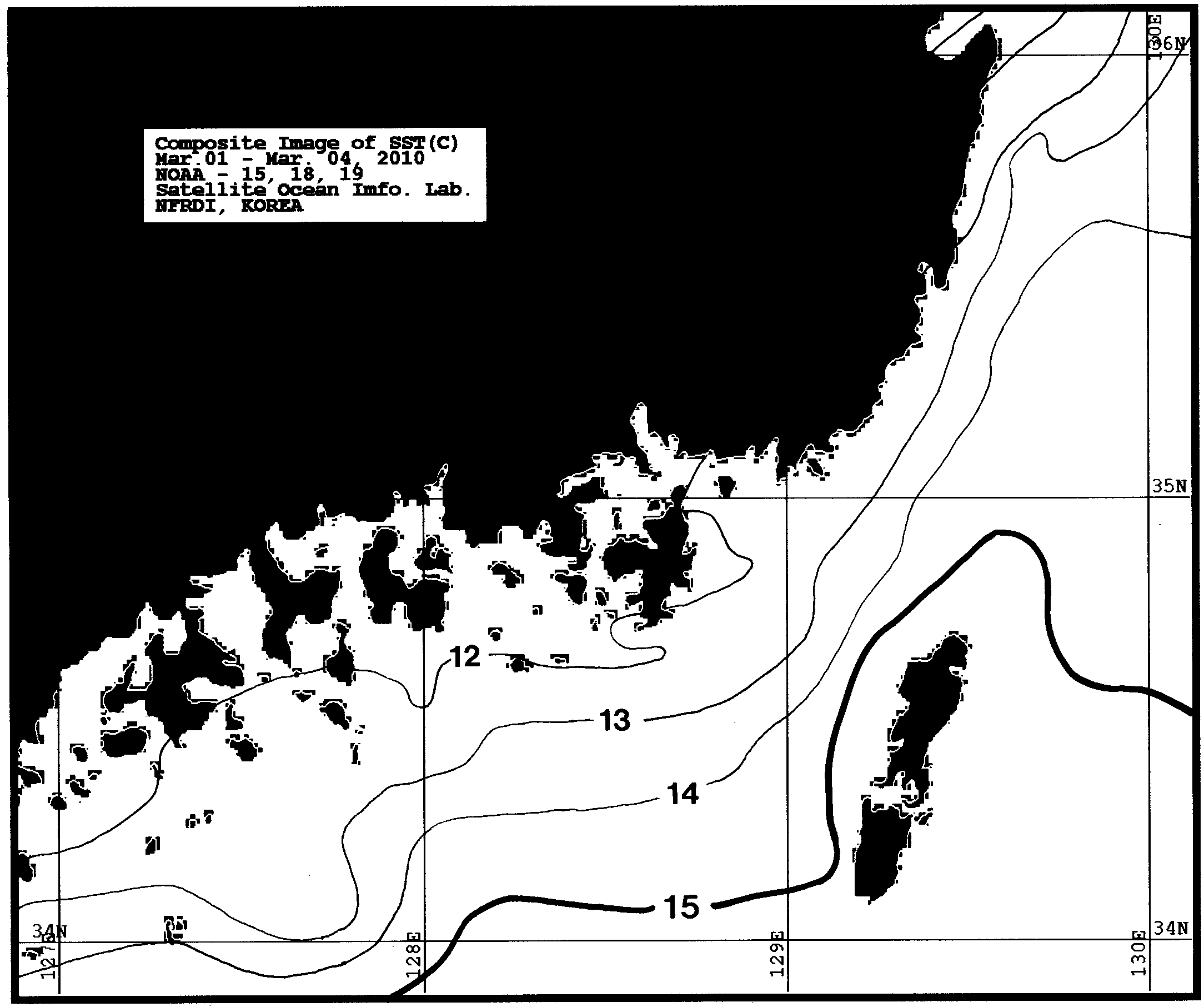 o 2010년 05월 04일자 남해 일원 수온 속보입니다. o 아래 그림은 2010년 05월 01일에서 05월 04일까지 합성한 위성 추정 표면수온입니다. o 금주(2010.05.01~2010.05.04)의 진해만 일원 표면수온은 12~13도로 나타납니다.