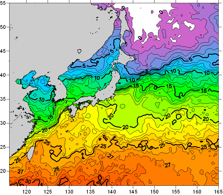o 2010년 05월 04일 북서태평양 광역해양 수온분포 입니다. o 아래 위성 수온분포도는 국립수산과학원(NFRDI, Korea)과 일본동북대학교 (Tohoku University, Japan)가 공동연구개발 진행중, 1차 연구결과인 것으로 구름의 영향을 배제한 신기술의 수온정보입니다.