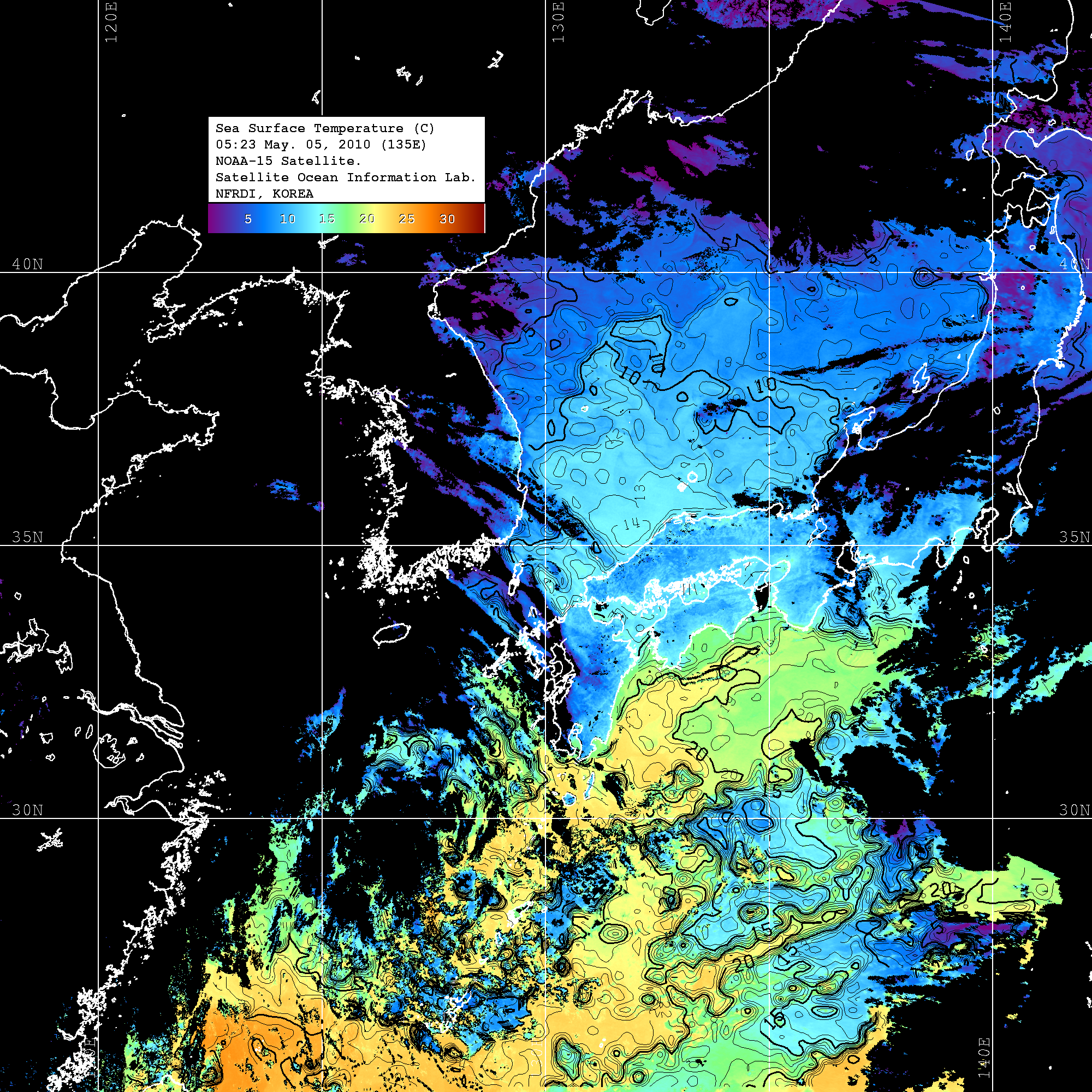 o 2010년 05월 05일 05시 23분 NOAA-15호 위성영상입니다. o 수온분포는 범례를 참고하시기 바랍니다. o 검은색은 구름을 나타냅니다. o 그림을 클릭하시면 크게 보실 수 있습니다.