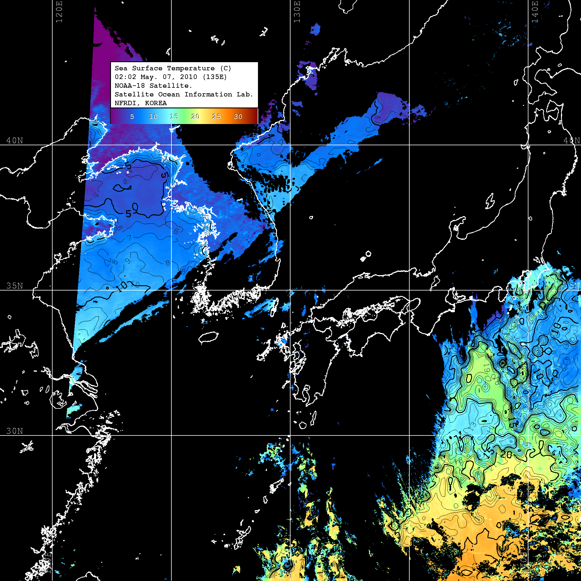 o 2010년 05월 07일 02시 02분 NOAA-18호 위성영상입니다. o 수온분포는 범례를 참고하시기 바랍니다. o 검은색은 구름을 나타냅니다. o 그림을 클릭하시면 크게 보실 수 있습니다.