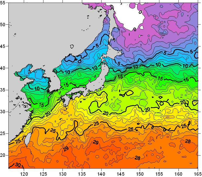 o 2010년 05월 06일 북서태평양 광역해양 수온분포 입니다. o 아래 위성 수온분포도는 국립수산과학원(NFRDI, Korea)과 일본동북대학교 (Tohoku University, Japan)가 공동연구개발 진행중, 1차 연구결과인 것으로 구름의 영향을 배제한 신기술의 수온정보입니다.