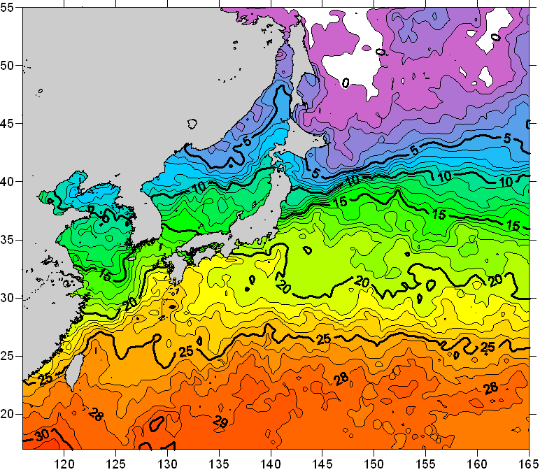 o 2010년 05월 07일 북서태평양 광역해양 수온분포 입니다. o 아래 위성 수온분포도는 국립수산과학원(NFRDI, Korea)과 일본동북대학교 (Tohoku University, Japan)가 공동연구개발 진행중, 1차 연구결과인 것으로 구름의 영향을 배제한 신기술의 수온정보입니다.