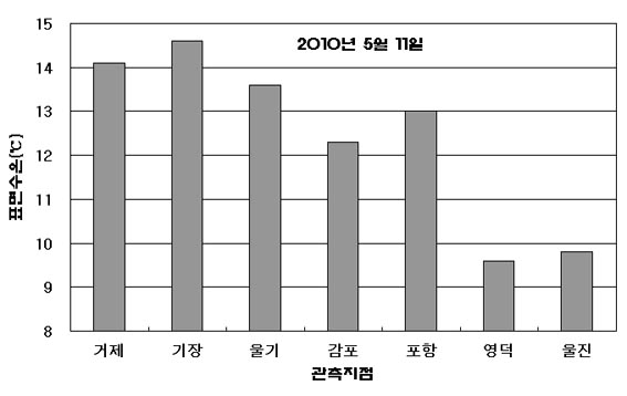 o 2010년 5월 11일 오전 10시 현재 동해 중남부 연안 냉수대 정보입니다. o 현재 연안 관측 표면수온은 영덕 9.6도, 울진 9.8도로, 주변해역인 포항(13.0도), 감포(12.3도), 울기(13.6도)에 비해 4도 정도 낮게 나타납니다. o 냉수대가 발생한 해역의 양식어업인, 조업인 및 해수욕장 주변 관광객은 급격한 수온변동에 주의하여 주시고 짙은 안개로 인한 선박운항에도 안전을 기하여 주시기 바랍니다.