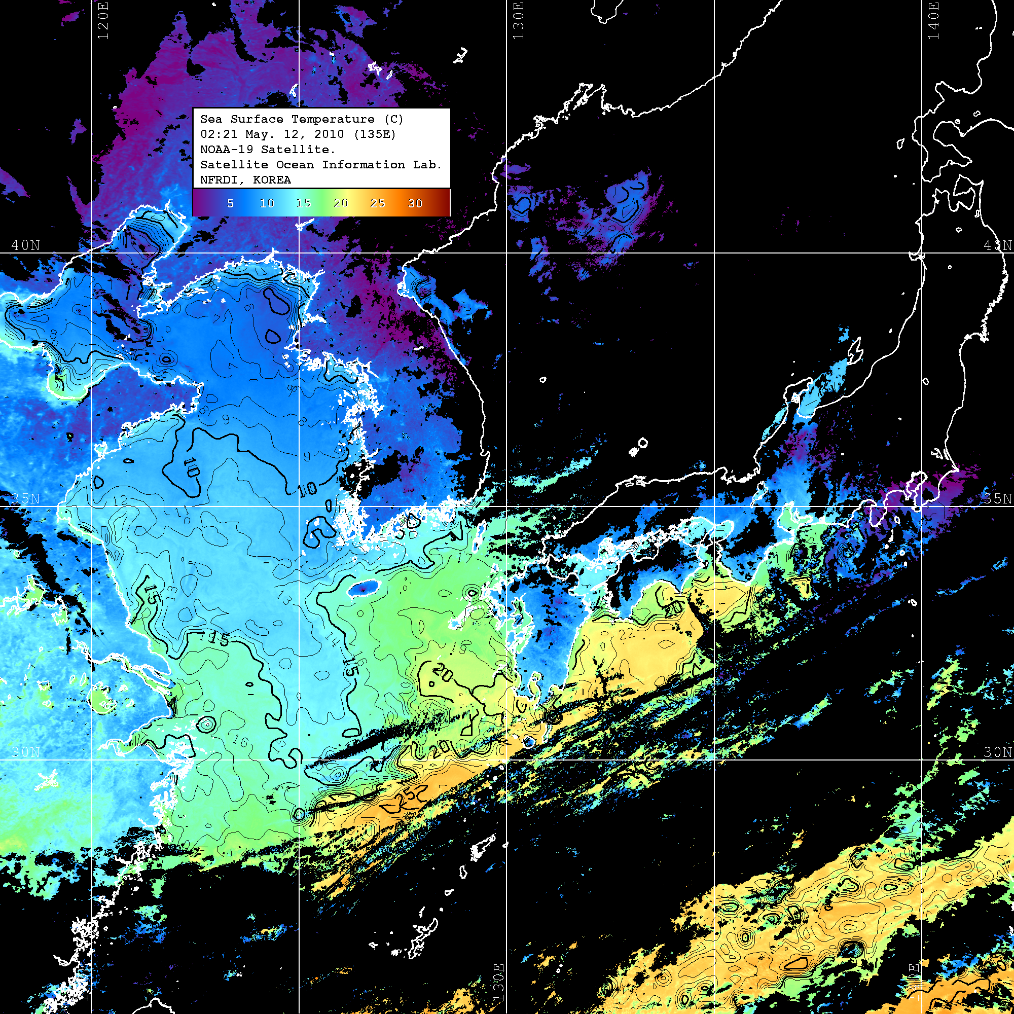 o 2010년 05월 12일 02시 21분 NOAA-19호 위성영상입니다. o 수온분포는 범례를 참고하시기 바랍니다. o 검은색은 구름을 나타냅니다. o 그림을 클릭하시면 크게 보실 수 있습니다.