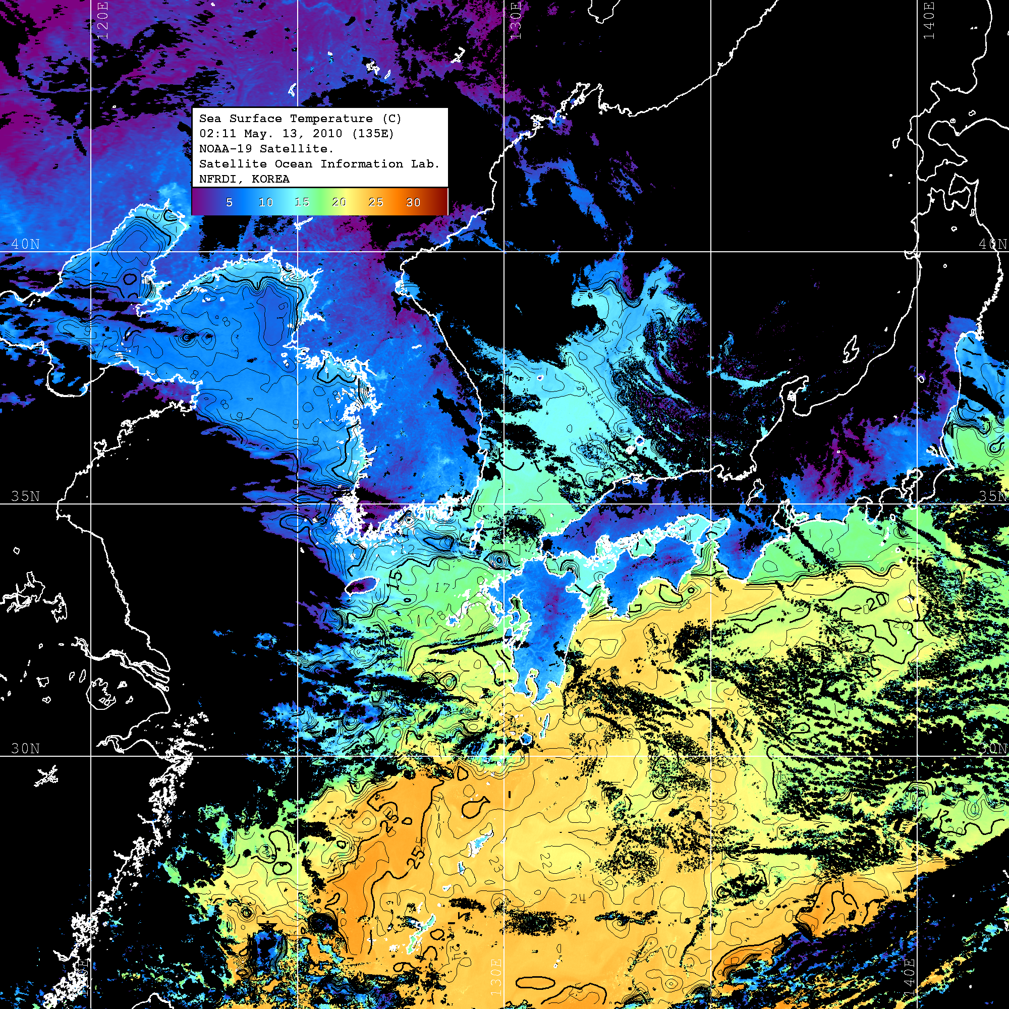 o 2010년 05월 13일 02시 11분 NOAA-19호 위성영상입니다. o 수온분포는 범례를 참고하시기 바랍니다. o 검은색은 구름을 나타냅니다. o 그림을 클릭하시면 크게 보실 수 있습니다.