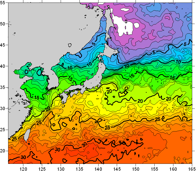 o 2010년 05월 13일 북서태평양 광역해양 수온분포 입니다. o 아래 위성 수온분포도는 국립수산과학원(NFRDI, Korea)과 일본동북대학교 (Tohoku University, Japan)가 공동연구개발 진행중, 1차 연구결과인 것으로 구름의 영향을 배제한 신기술의 수온정보입니다.