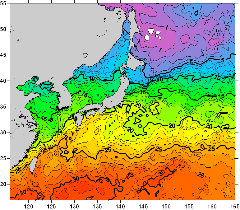 o 2010년 05월 14일 북서태평양 광역해양 수온분포 입니다. o 아래 위성 수온분포도는 국립수산과학원(NFRDI, Korea)과 일본동북대학교 (Tohoku University, Japan)가 공동연구개발 진행중, 1차 연구결과인 것으로 구름의 영향을 배제한 신기술의 수온정보입니다.