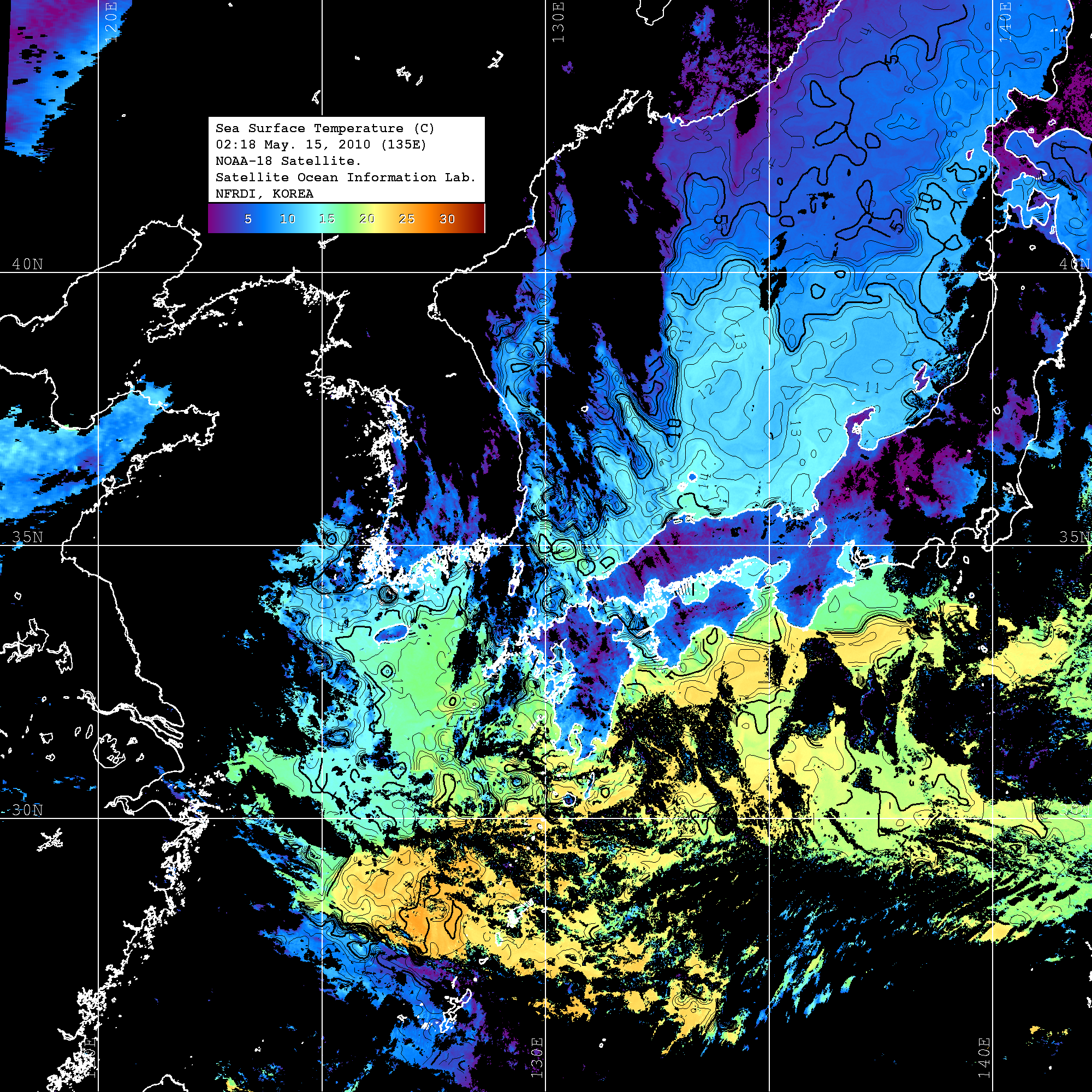 o 2010년 05월 15일 02시 18분 NOAA-18호 위성영상입니다. o 수온분포는 범례를 참고하시기 바랍니다. o 검은색은 구름을 나타냅니다. o 그림을 클릭하시면 크게 보실 수 있습니다.
