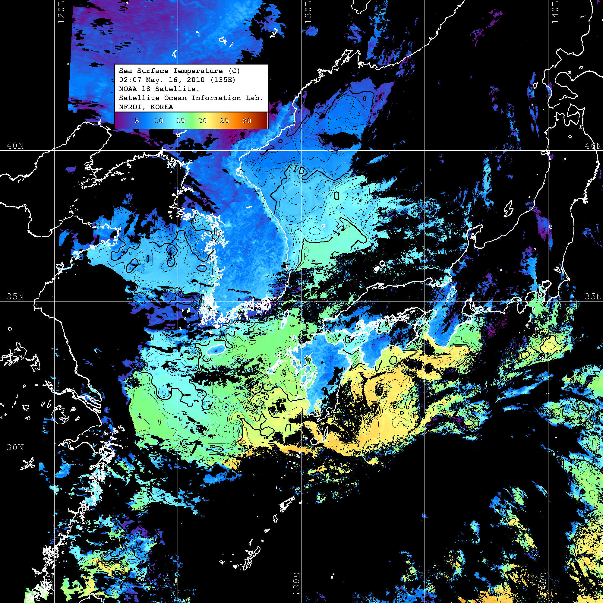 o 2010년 05월 16일 02시 07분 NOAA-18호 위성영상입니다. o 수온분포는 범례를 참고하시기 바랍니다. o 검은색은 구름을 나타냅니다. o 그림을 클릭하시면 크게 보실 수 있습니다.
