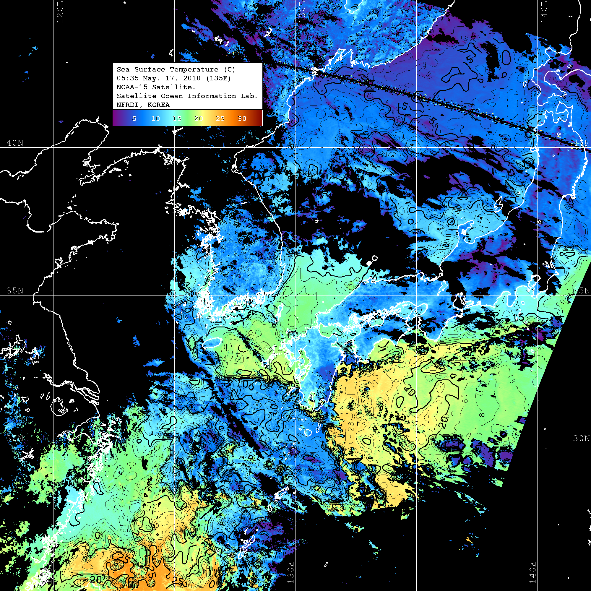 o 2010년 05월 17일 05시 35분 NOAA-15호 위성영상입니다. o 수온분포는 범례를 참고하시기 바랍니다. o 검은색은 구름을 나타냅니다. o 그림을 클릭하시면 크게 보실 수 있습니다.