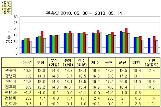 o 금주(2010.05.08~2010.05.14)의 한반도 연안 표면수온은 동해 연안역에서 섭씨 10.5~15.0도, 남해 연안역 16.0~17.0도, 서해 연안역에서 12.5~18.5도로 나타납니다. o 평년에 비해 부산(기장) 비슷함을 제외한 동해 연안역은 1.0~1.5도 낮게, 남해 연안역은 비슷하게, 목포 1.0도 낮음을 제외한 서해 연안역은 0.5~1.5도 높게 나타납니다. o 전년에 비해 부산(기장) 비슷함을 제외한 동해 연안역은 2.0~5.0도 낮게, 남해 연안역은 1.0~2.5도 낮게, 서해 연안역은 0.5~3.0도 낮게 나타납니다.