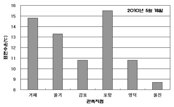 o 2010년 5월 18일 오전 10시 현재 동해 중남부 연안 냉수대 정보입니다. o 현재 연안 관측 표면수온은 울진 8.7도, 영덕 10.8도, 감포 10.8도로 주변해역인 포항(15.5도), 울기(13.3도)에 비해 4도 정도 낮게 나타납니다. o 냉수대가 발생한 해역의 양식어업인, 조업인 및 해수욕장 주변 관광객은 급격한 수온변동에 주의하여 주시고 짙은 안개로 인한 선박운항에도 안전을 기하여 주시기 바랍니다.