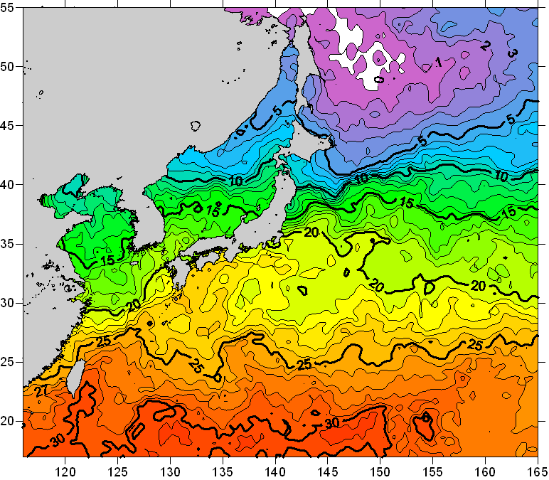 o 2010년 05월 17일 북서태평양 광역해양 수온분포 입니다. o 아래 위성 수온분포도는 국립수산과학원(NFRDI, Korea)과 일본동북대학교 (Tohoku University, Japan)가 공동연구개발 진행중, 1차 연구결과인 것으로 구름의 영향을 배제한 신기술의 수온정보입니다.
