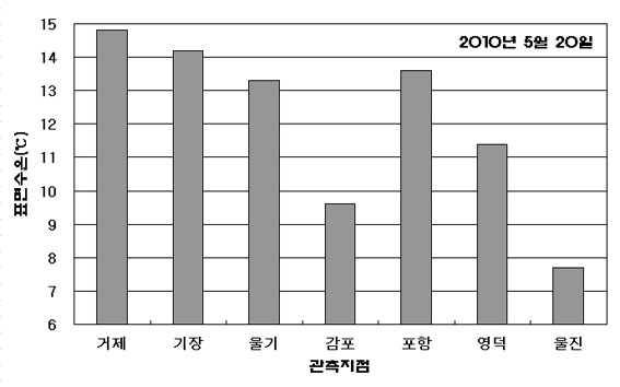 o 2010년 5월 20일 오전 10시 현재 동해 중남부 연안 냉수대 정보입니다. o 현재 연안 관측 표면수온은 울진 7.7도, 영덕 11.4도, 감포 9.6도로 주변해역인 포항(13.6도), 울기(13.3도), 기장(14.2도)에 비해 5도 정도 낮게 나타납니다. o 냉수대가 발생한 해역의 양식어업인, 조업인 및 해수욕장 주변 관광객은 급격한 수온변동에 주의하여 주시고 짙은 안개로 인한 선박운항에도 안전을 기하여 주시기 바랍니다.