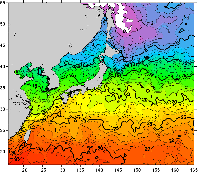 o 2010년 05월 20일 북서태평양 광역해양 수온분포 입니다. o 아래 위성 수온분포도는 국립수산과학원(NFRDI, Korea)과 일본동북대학교 (Tohoku University, Japan)가 공동연구개발 진행중, 1차 연구결과인 것으로 구름의 영향을 배제한 신기술의 수온정보입니다.