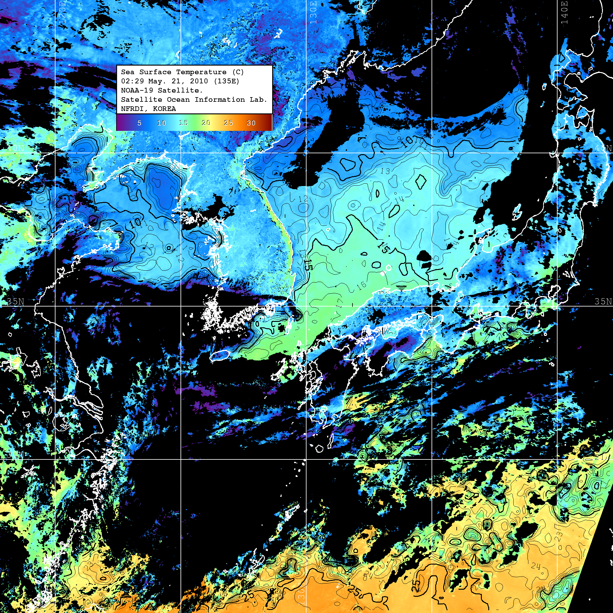 o 2010년 05월 21일 02시 29분 NOAA-19호 위성영상입니다. o 수온분포는 범례를 참고하시기 바랍니다. o 검은색은 구름을 나타냅니다. o 그림을 클릭하시면 크게 보실 수 있습니다.