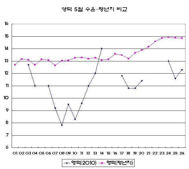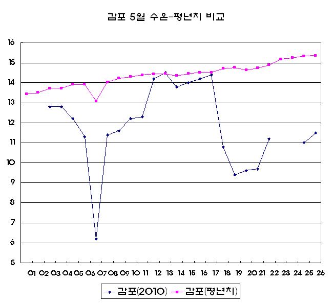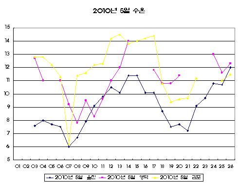 o 2010년 05월 03일부터 05월 26일 까지 울진, 영덕 및 감포 연안에서 관측한 표층수온 자료입니다 (그림 1, 2, 3 및 4). 5월 7일 부근과 20일 부근에서 강한 냉수대가 형성되었으나, 26일 현재 냉수대가 약해지고 있습니다 (그림 1). o 그러나 5월 수온 평년치 자료와 2010년 05월 관측 수온 자료를 비교해 보면 울진 연안은 약 2℃, 영덕 연안은 약 3℃ 그리고 감포 연안은 약 4℃낮게 나타나고 있습니다 (그림 2, 3 및 4). o 따라서 냉수대가 발생한 해역의 양식어업인, 조업인 및 해수욕장 주변 관광객은 급격한 수온변동에 주의하여 주시고 짙은 안개로 인한 선박운항에도 안전을 기하여 주시기 바랍니다.