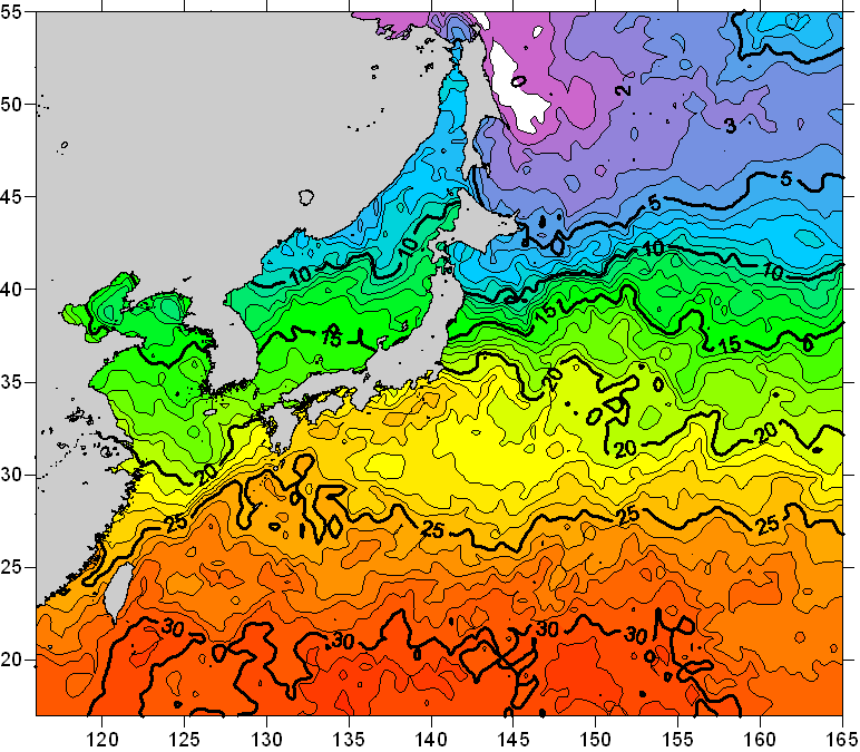 o 2010년 05월 27일 북서태평양 광역해양 수온분포 입니다. o 아래 위성 수온분포도는 국립수산과학원(NFRDI, Korea)과 일본동북대학교 (Tohoku University, Japan)가 공동연구개발 진행중, 1차 연구결과인 것으로 구름의 영향을 배제한 신기술의 수온정보입니다.