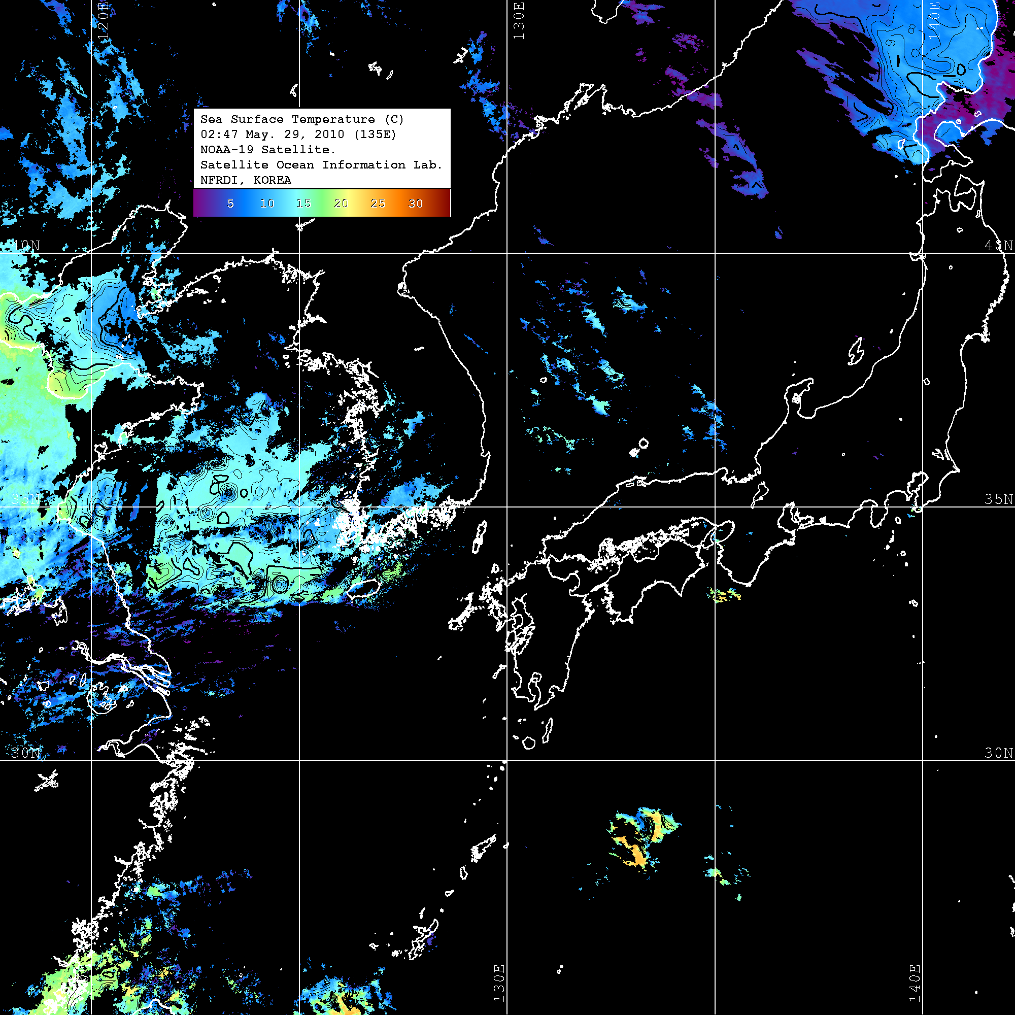 o 2010년 05월 29일 02시 47분 NOAA-19호 위성영상입니다. o 수온분포는 범례를 참고하시기 바랍니다. o 검은색은 구름을 나타냅니다. o 그림을 클릭하시면 크게 보실 수 있습니다.