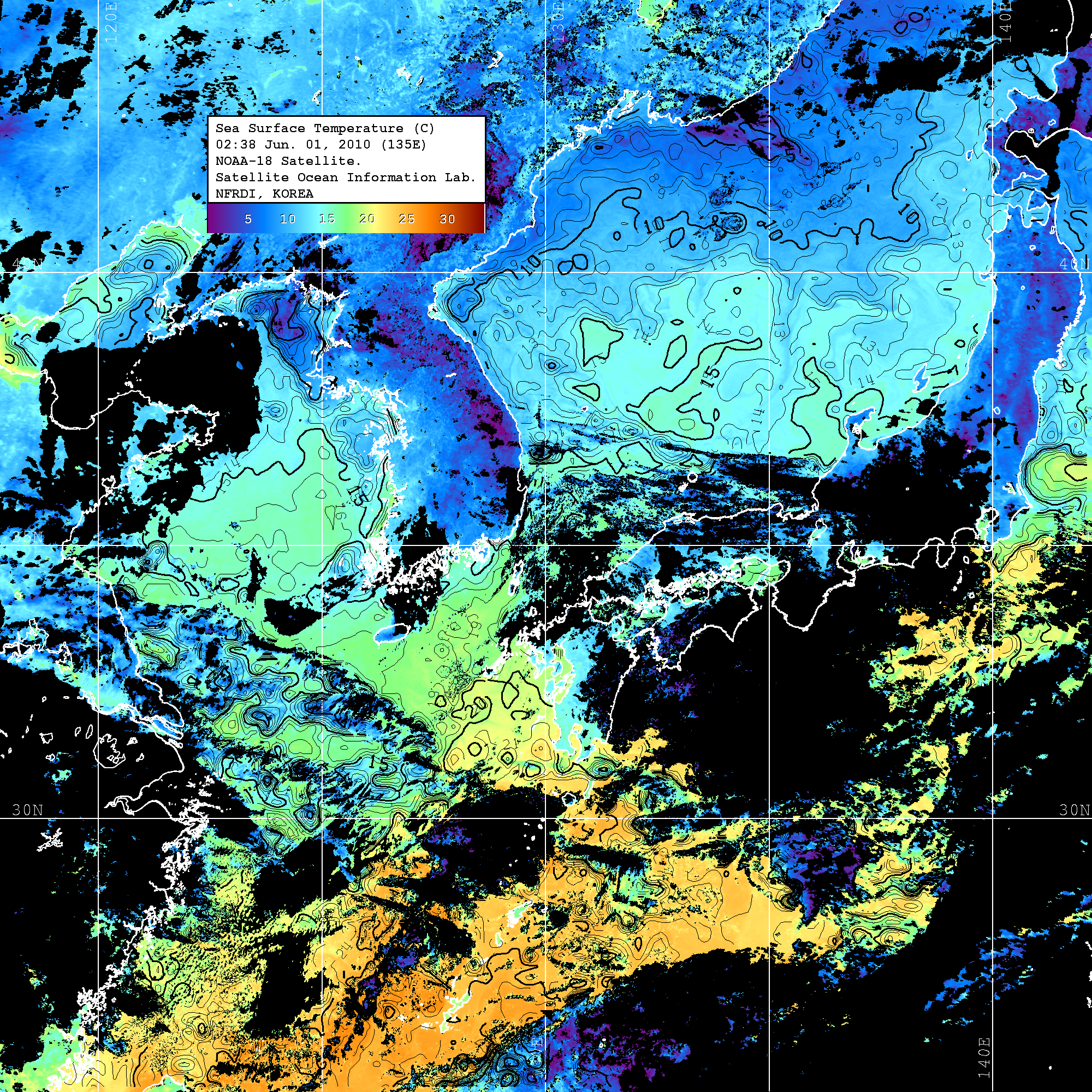 o 2010년 06월 01일 02시 38분 NOAA-18호 위성영상입니다. o 수온분포는 범례를 참고하시기 바랍니다. o 검은색은 구름을 나타냅니다. o 그림을 클릭하시면 크게 보실 수 있습니다.
