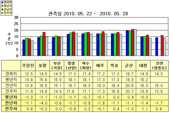 o 금주(2010.05.22~2010.05.28)의 한반도 연안 표면수온은 동해 연안역에서 섭씨 12.5~14.5도, 남해 연안역 17.0~17.5도, 서해 연안역에서 14.0~20.0도로 나타납니다. o 평년에 비해 동해 연안역은 1.0~1.5도 낮게, 제주 비슷함을 제외한 남해 연안역은 0.5~1.5도 낮게, 대천 0.3도 낮음을 제외한 서해 연안역은 0.5도 높게 나타납니다. o 전년에 비해 동해 연안역은 0.5~4.0도 낮게, 남해 연안역은 0.5~2.0도 낮게, 서해 연안역은 1.0~2.0도 낮게 나타납니다.