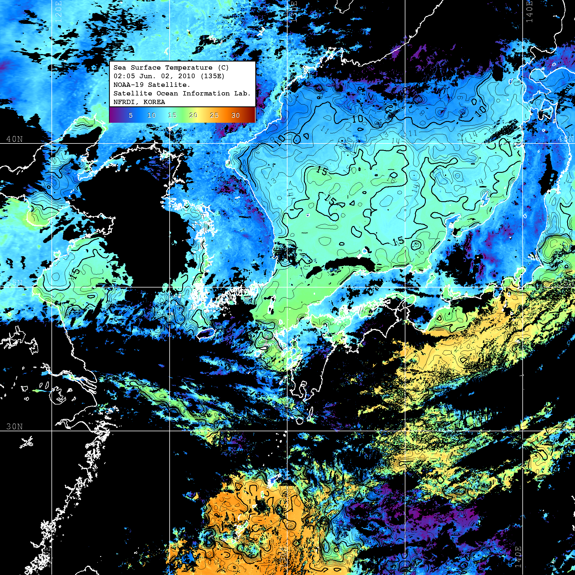 o 수온분포는 범례를 참고하시기 바랍니다. o 검은색은 구름을 나타냅니다. o 그림을 클릭하시면 크게 보실 수 있습니다.