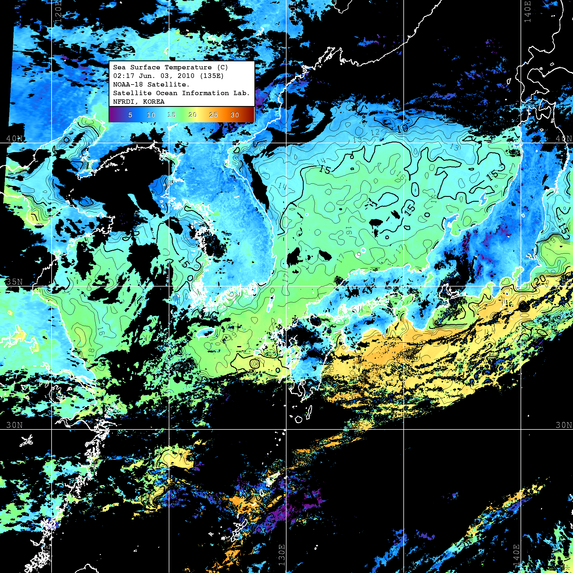 o 수온분포는 범례를 참고하시기 바랍니다. o 검은색은 구름을 나타냅니다. o 그림을 클릭하시면 크게 보실 수 있습니다.