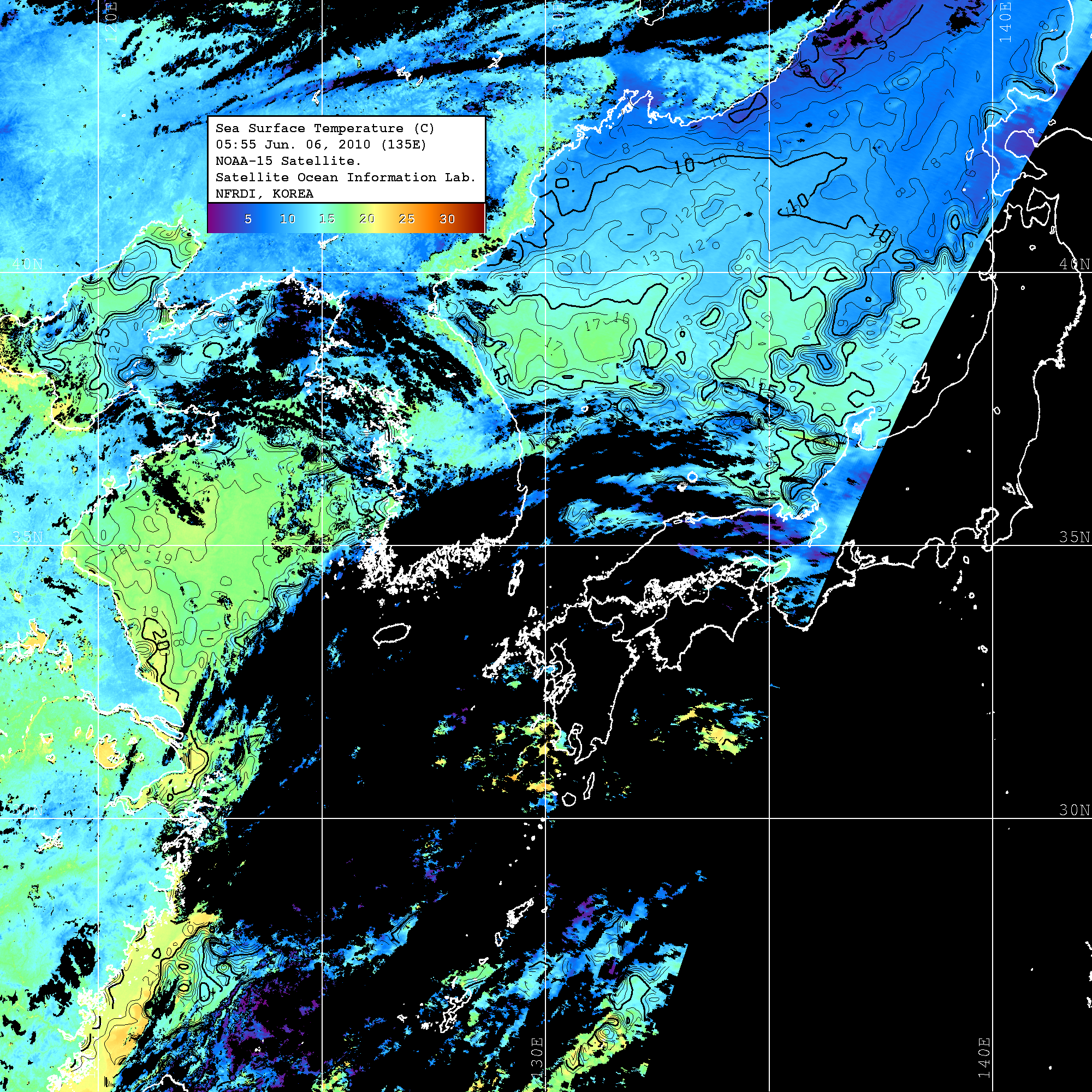 o 2010년 06월 06일 05시 55분 NOAA-15호 위성영상입니다. o 수온분포는 범례를 참고하시기 바랍니다. o 검은색은 구름을 나타냅니다. o 그림을 클릭하시면 크게 보실 수 있습니다.