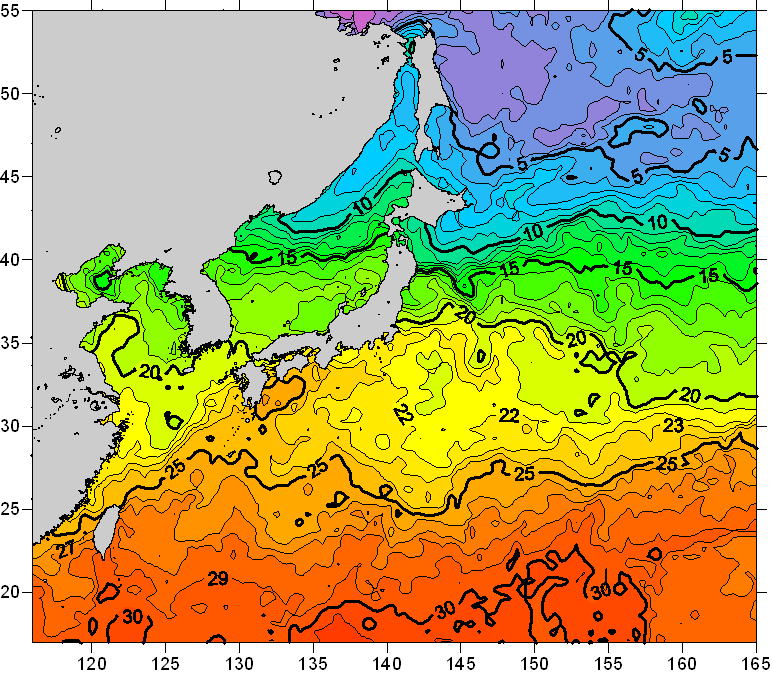 o 2010년 06월 06일 북서태평양 광역해양 수온분포 입니다. o 아래 위성 수온분포도는 국립수산과학원(NFRDI, Korea)과 일본동북대학교 (Tohoku University, Japan)가 공동연구개발 진행중, 1차 연구결과인 것으로 구름의 영향을 배제한 신기술의 수온정보입니다.