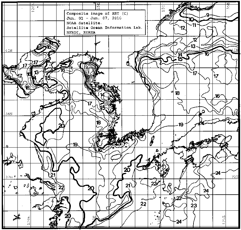o 금주(2010.06.01~2010.06.07)의 한국근해 표면수온은 대화퇴 근해 15~17도, 울릉도 근해 18~19도, 대마도 근해 18~20도, 제주도 근해 17~19도, 이어도 근해 19~20도, 가거초 근해 15~17도, 어청도 근해 15~17도로 나타납니다. o「평년에 비해」대화퇴 근해 0.8도 높게, 울릉도 근해 0.8도 높게, 대마도 근해 비슷하게, 제주도 근해 0.5도 낮게, 이어도 근해 0.4도 높게, 가거초 근해 1.5도 낮게, 어청도 근해는 0.7도 낮게 나타납니다. o「전년에 비해」대화퇴 근해 2.0도 높게, 울릉도 근해 0.2도 높게, 대마도 근해 2.0도 높게, 제주도 근해 1.0도 낮게, 이어도 근해 비슷하게, 가거초 근해 2.0도 낮게, 어청도 근해는 1.5도 낮게 나타납니다. o 수온 전선대는 우리나라 제주해협에서 대한해협까지 18도를 중심으로 형성됩니다.