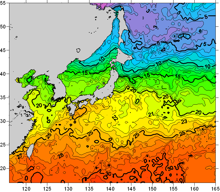 o 2010년 06월 07일 북서태평양 광역해양 수온분포 입니다. o 아래 위성 수온분포도는 국립수산과학원(NFRDI, Korea)과 일본동북대학교 (Tohoku University, Japan)가 공동연구개발 진행중, 1차 연구결과인 것으로 구름의 영향을 배제한 신기술의 수온정보입니다.