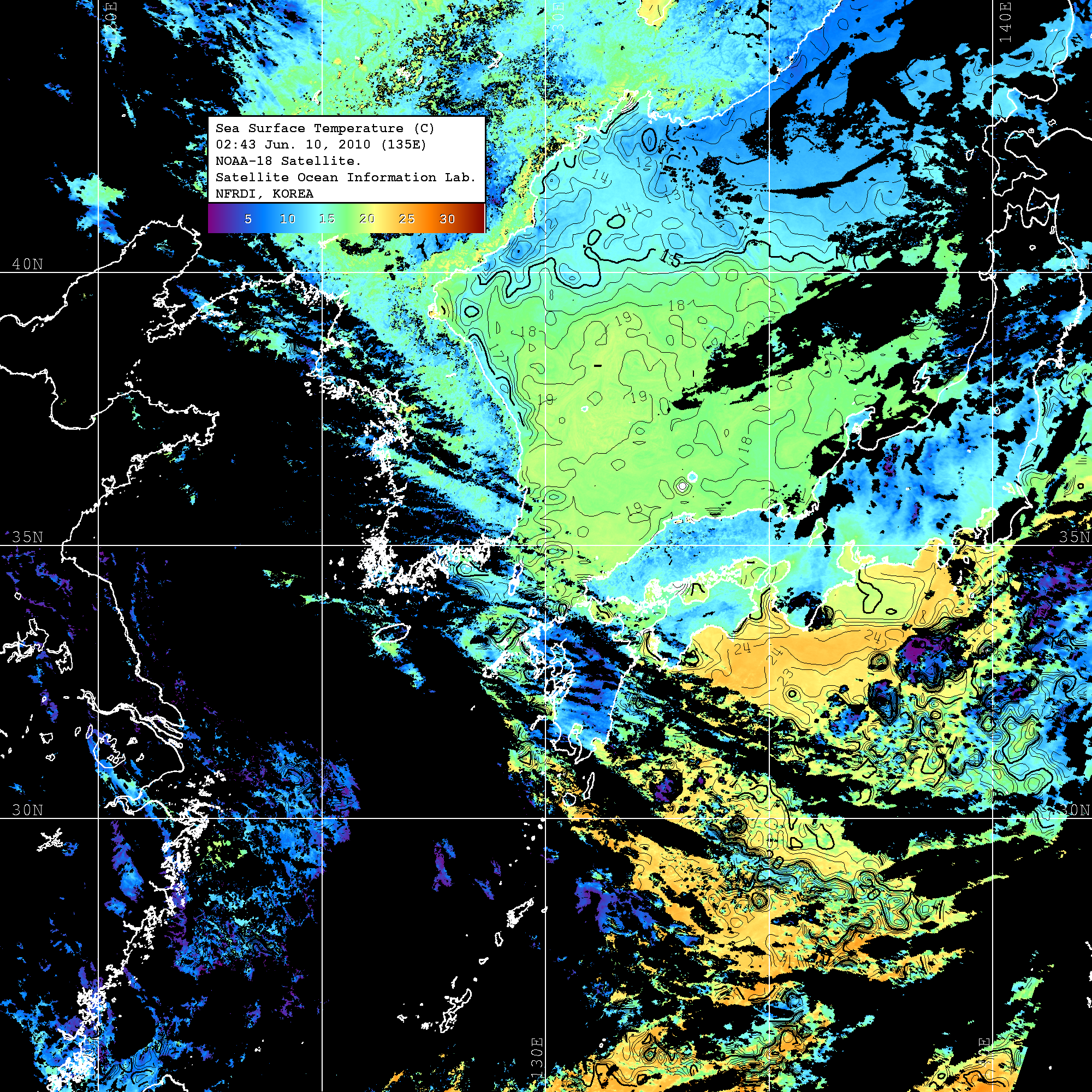 o 2010년 06월 10일 02시 43분 NOAA-18호 위성영상입니다. o 수온분포는 범례를 참고하시기 바랍니다. o 검은색은 구름을 나타냅니다. o 그림을 클릭하시면 크게 보실 수 있습니다.
