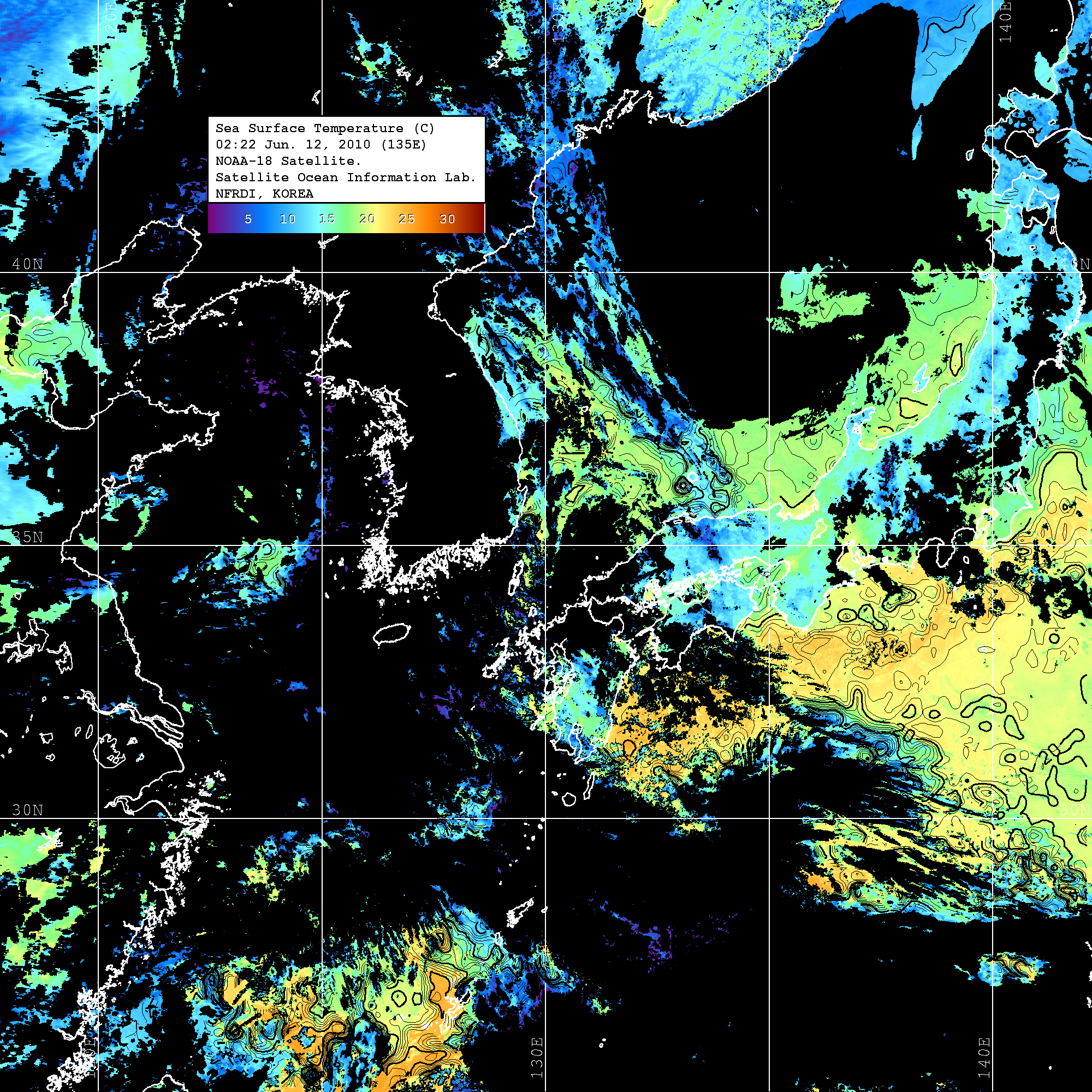o 2010년 06월 12일 02시 22분 NOAA-18호 위성영상입니다. o 수온분포는 범례를 참고하시기 바랍니다. o 검은색은 구름을 나타냅니다. o 그림을 클릭하시면 크게 보실 수 있습니다.