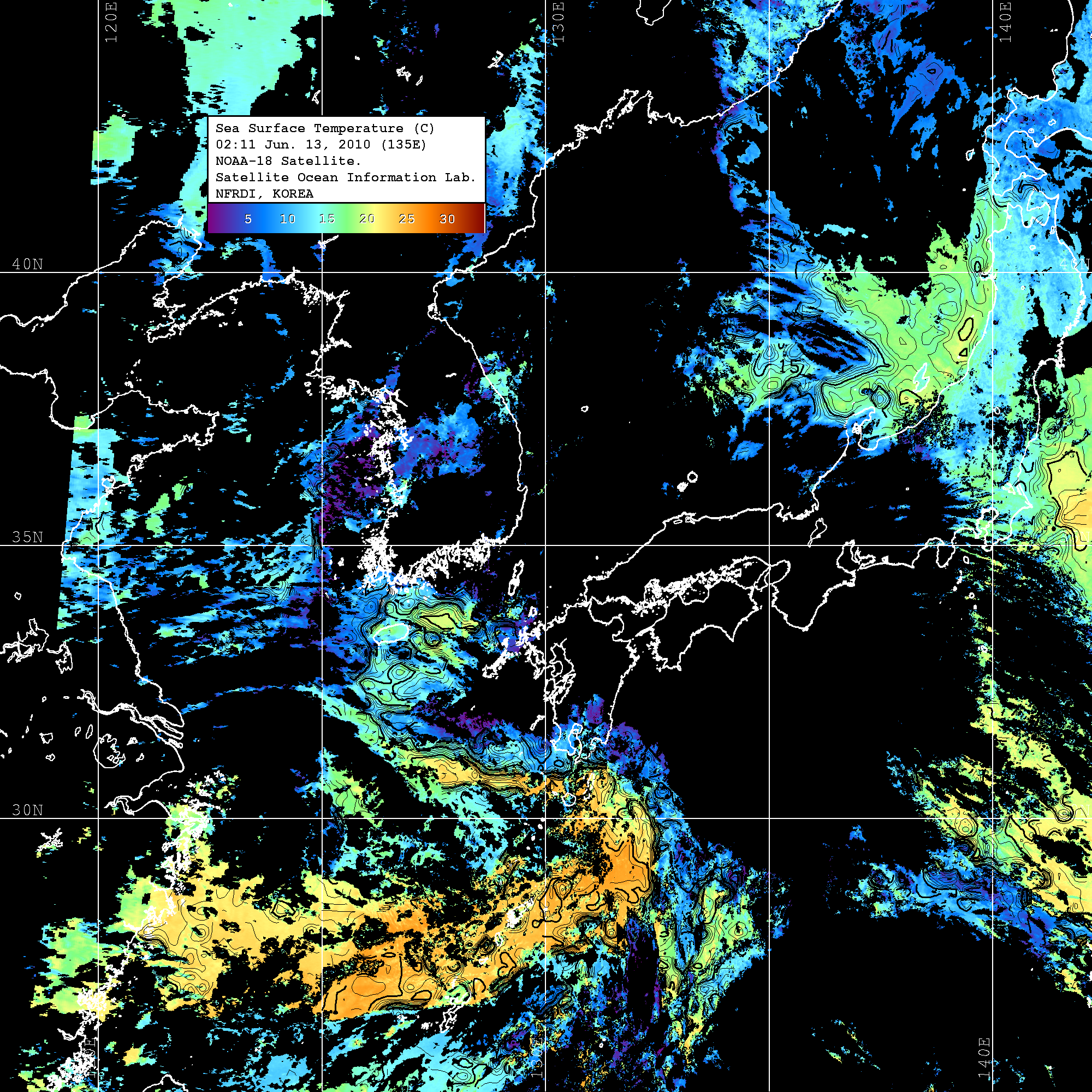 o 2010년 06월 13일 02시 11분 NOAA-18호 위성영상입니다. o 수온분포는 범례를 참고하시기 바랍니다. o 검은색은 구름을 나타냅니다. o 그림을 클릭하시면 크게 보실 수 있습니다.
